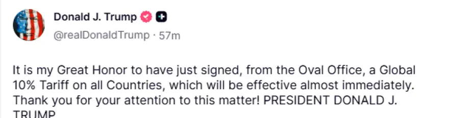 “It is my great honor to have just signed in the Oval Office a 10% global tariff on all countries, which will take effect almost immediately,” Trump wrote in a post on Truth Social at 01:40 (Greece time).